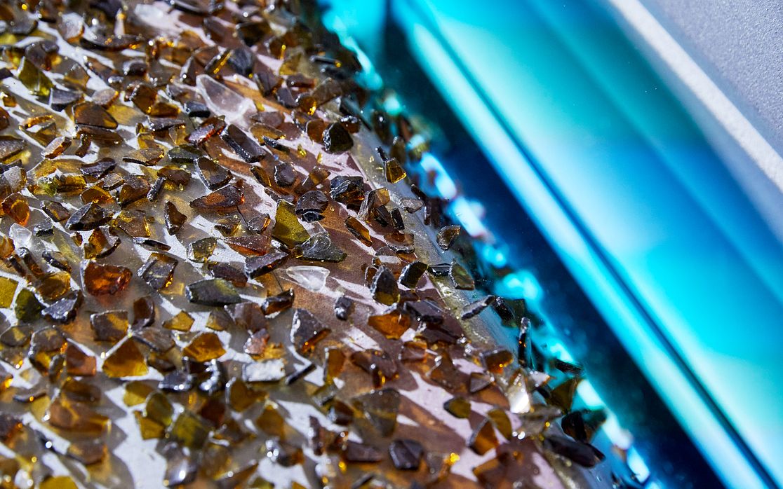 Sebrané skleněné odpady dodané do závodu Vetropack v Kyjově procházejí několika kroky zpracování. Nejprve se odstraní kovové a objemné nečistoty, materiál se vysuší a zbaví etiket. Následuje optické třídění, které zajistí odstranění drobných nečistot a roztřídění podle základních barev. Nejjemnější částice jsou pomlety na skleněný prach, který společně s barevně vytříděnými střepy tvoří klíčovou surovinu pro tavení nového skla.